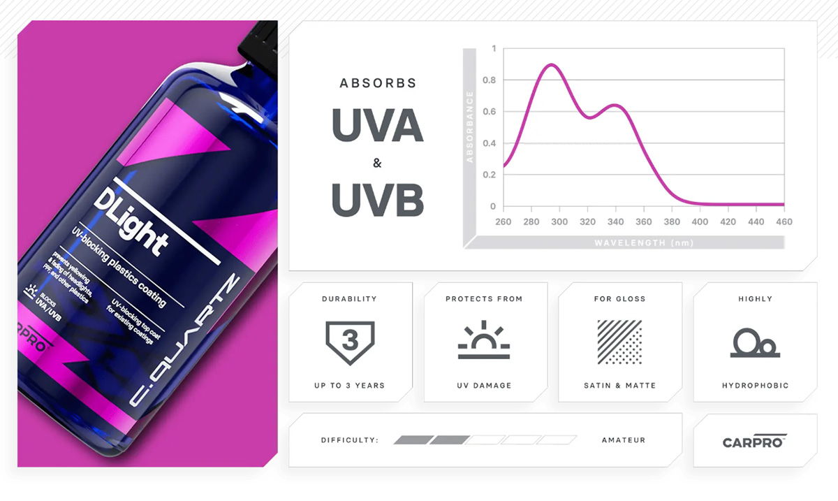 Σε σύγκριση με άλλες πλαστικές επικαλύψεις, το DLight ενισχύεται με ισχυρούς απορροφητές υπεριώδους ακτινοβολίας και σταθεροποιητές φωτός για ευρύτερο φάσμα απόρριψης από 260 nm έως 360 nm, εμποδίζοντας το πιο επιβλαβές φως UVA και UVB. Αυτό το προηγμένο προστατευτικό στρώμα προστατεύει τις ευαίσθητες επιφάνειες από τις βλαβερές υπεριώδεις ακτίνες, αποτρέποντας το κιτρίνισμα, το ξεθώριασμα και το ράγισμα με την πάροδο του χρόνου. Σχεδιασμένη για να ενισχύει την ανθεκτικότητα και τη διαύγεια, η επίστρωση όχι μόνο διατηρεί την παρθένα εμφάνιση των προβολέων, του PPF και των πλαστικών επενδύσεων, αλλά εξασφαλίζει επίσης μακροχρόνια απόδοση προστατεύοντας από απώλεια γυαλάδας, αποχρωματισμό και βελτιώνοντας την αντοχή στις γρατσουνιές.